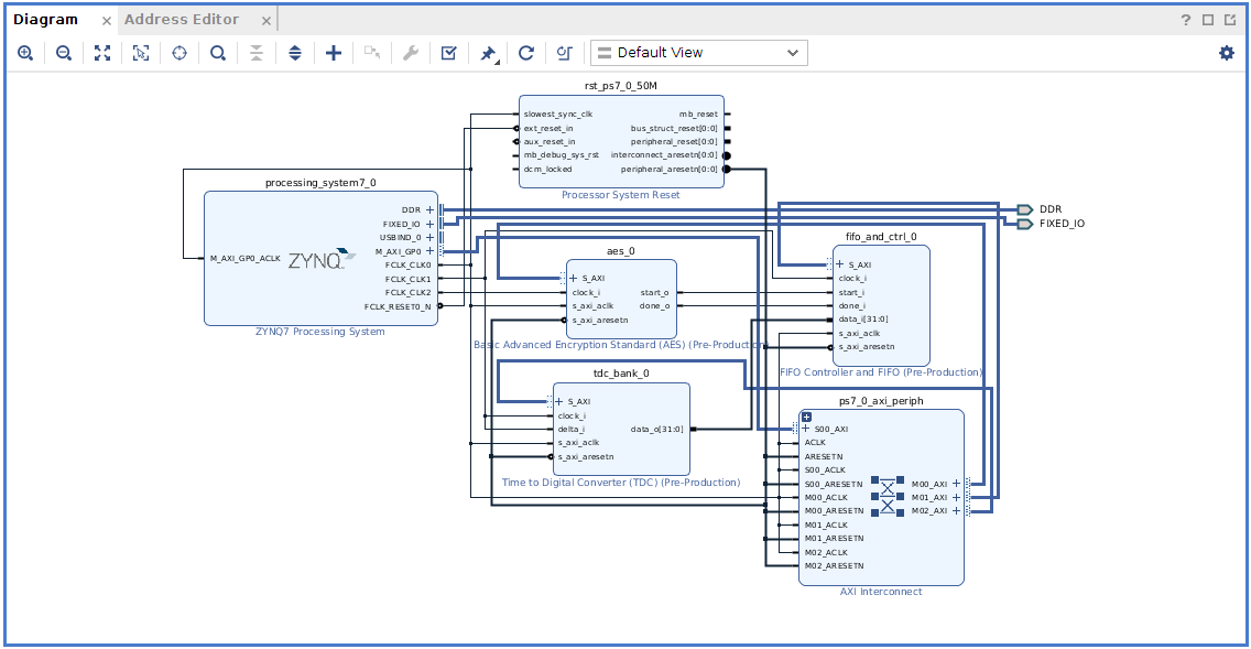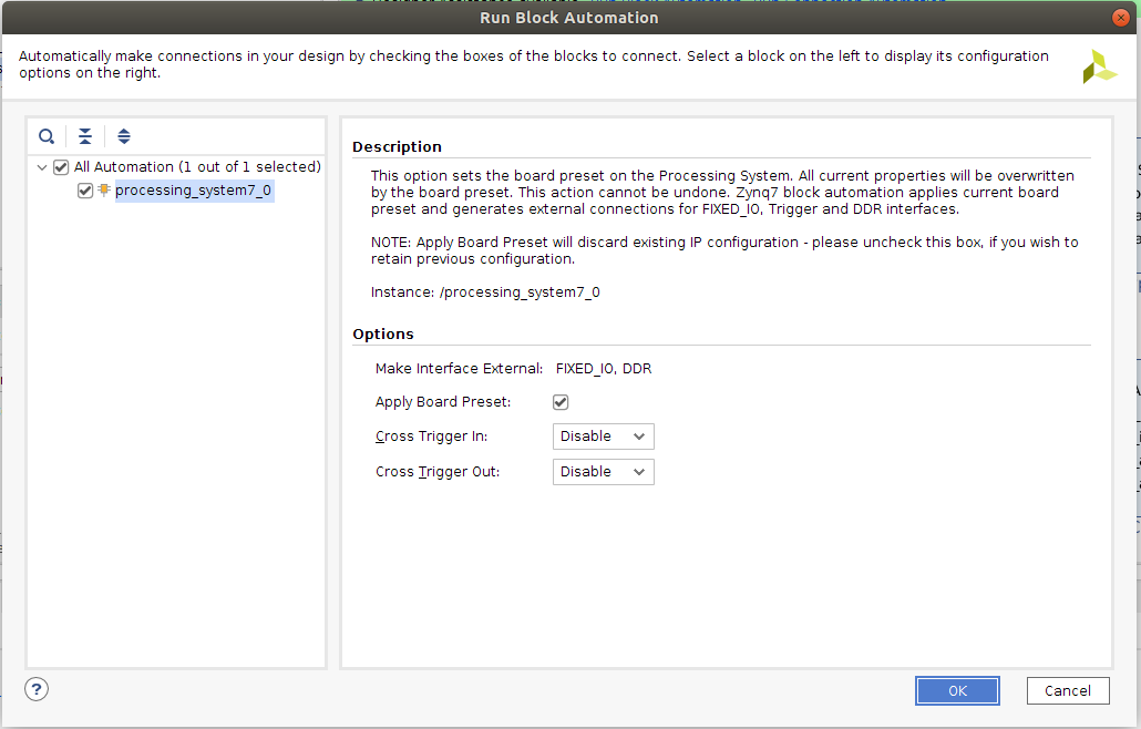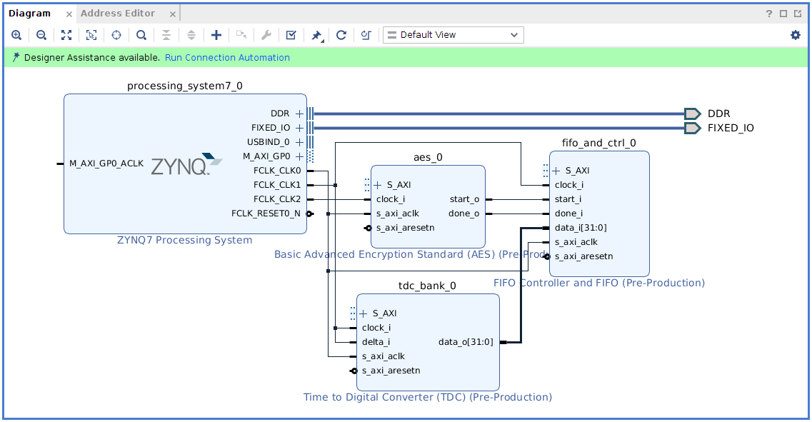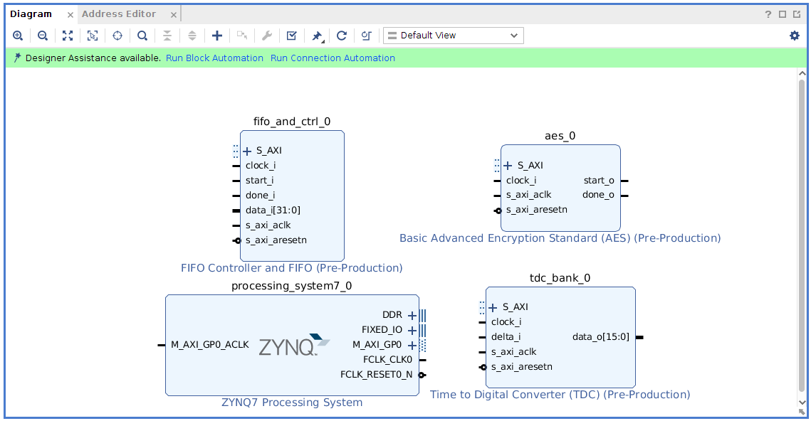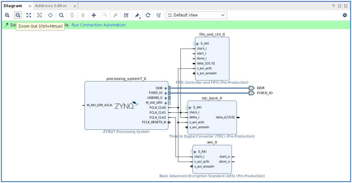 Vivado automatically adds interconnect and reset AXI blocks. The design is ready.