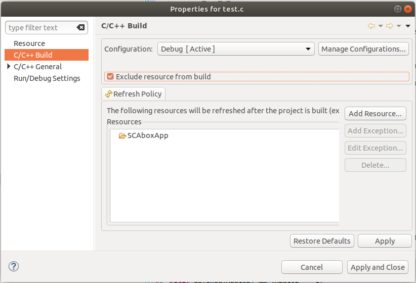 Right click on the SCAboxApp/tiny-AES-c/test.c source in the arborescence and select properties.
