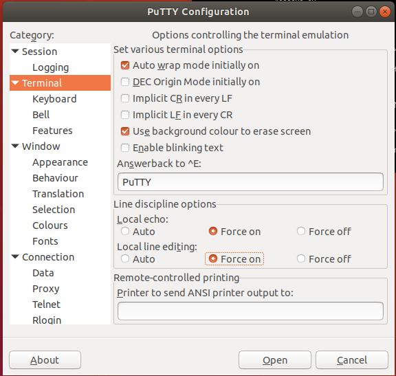 The terminal emulator allows to communicate via UART with the SoC. It must be configured properly in order to work and allow command typing. Bellow is given the emulator configuration used :