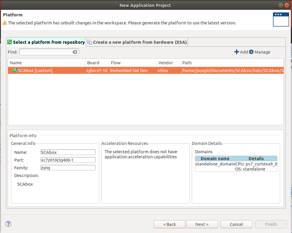 If you are using Xilinx SDK instead of Vitis, you do not have a .xsa file but a .hdf file (hardware definition).