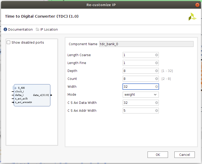 Double click on the Time to Digital Converter IP block and set Depth to 8 (resolution), Count to 8 (number of sensor), Width to 32 (data width for storage).