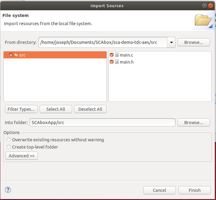 Add the .c and .h files from your_path/sca-demo-tdc-aes/src