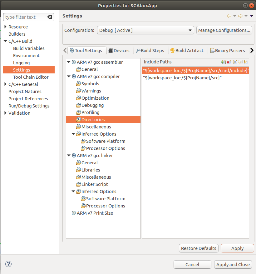 In the Settings tab go to ARM v7 gcc compiler > Directories