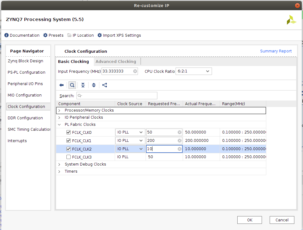 In the PL Fabric clock arborescence check FCLK_CLK0 and set its frequency to 50MHz (AXI clock), check FCLK_CLK1 and set its frequency to 200MHz (sensor clock), check FCLK_CLK2 and set its frequency to 10MHz (target clock).