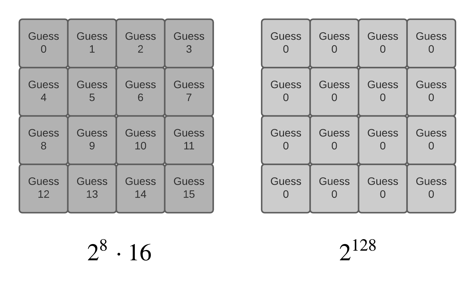 For example with the AES128 algorithm, it leads to formulating \(256 \cdot 16\) key hypothesis. In contrast, an explicit brute force attack in the same conditions would require formulating \(2^{128}\) key hypothesis.