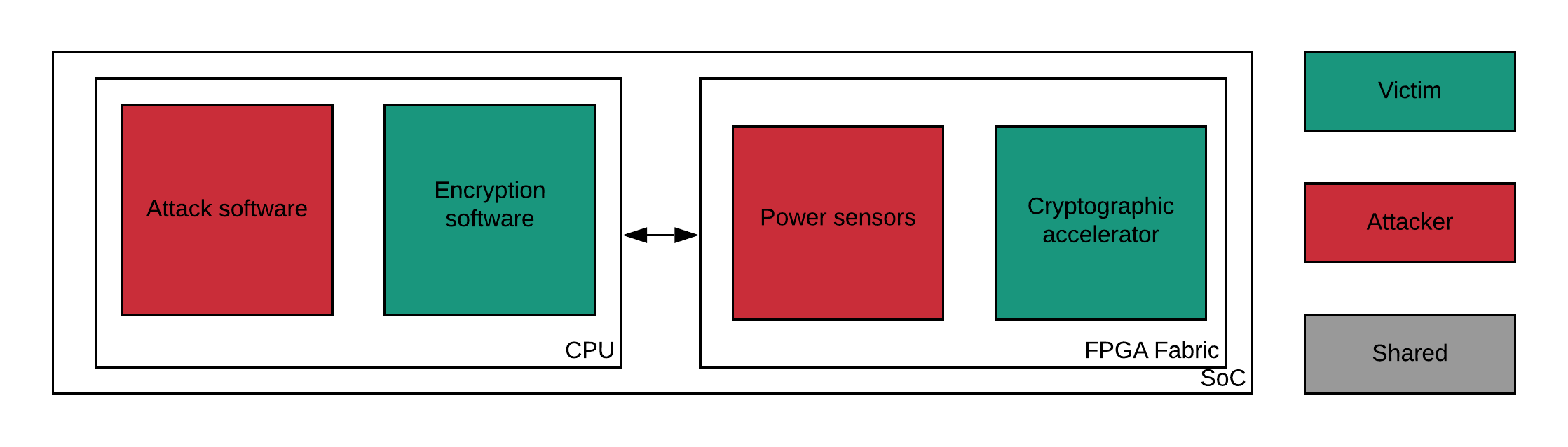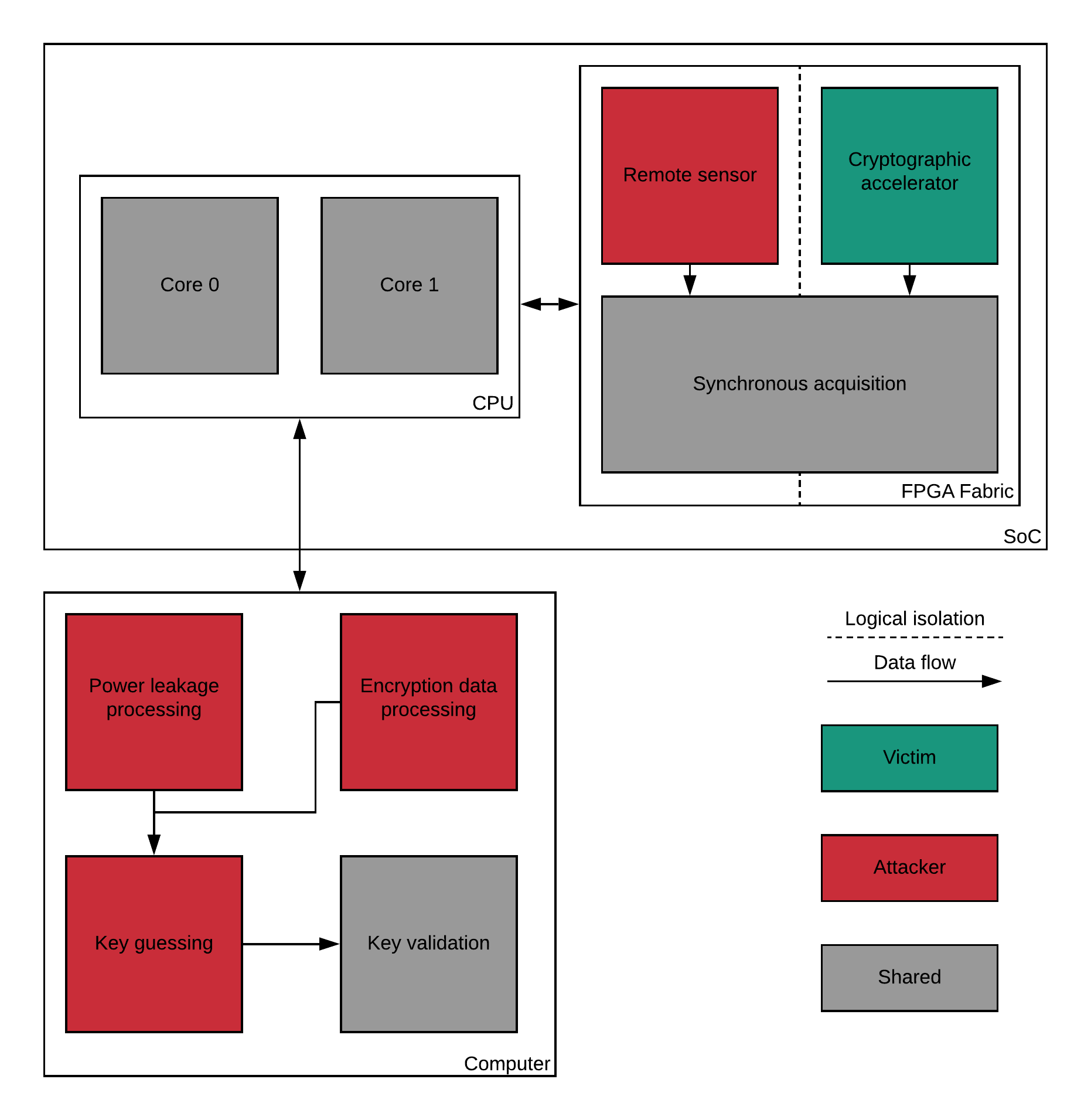 The cores are considered shared even if they can be completely owned by the attacker or the victim. In our most simple configuration, one core is used both as a victim, performing crypto-computation, and as an attacker, communicating leakage and encryption data. More sophisticated configurations separates attacker and victim cores in order to produce a more realistic leakage.