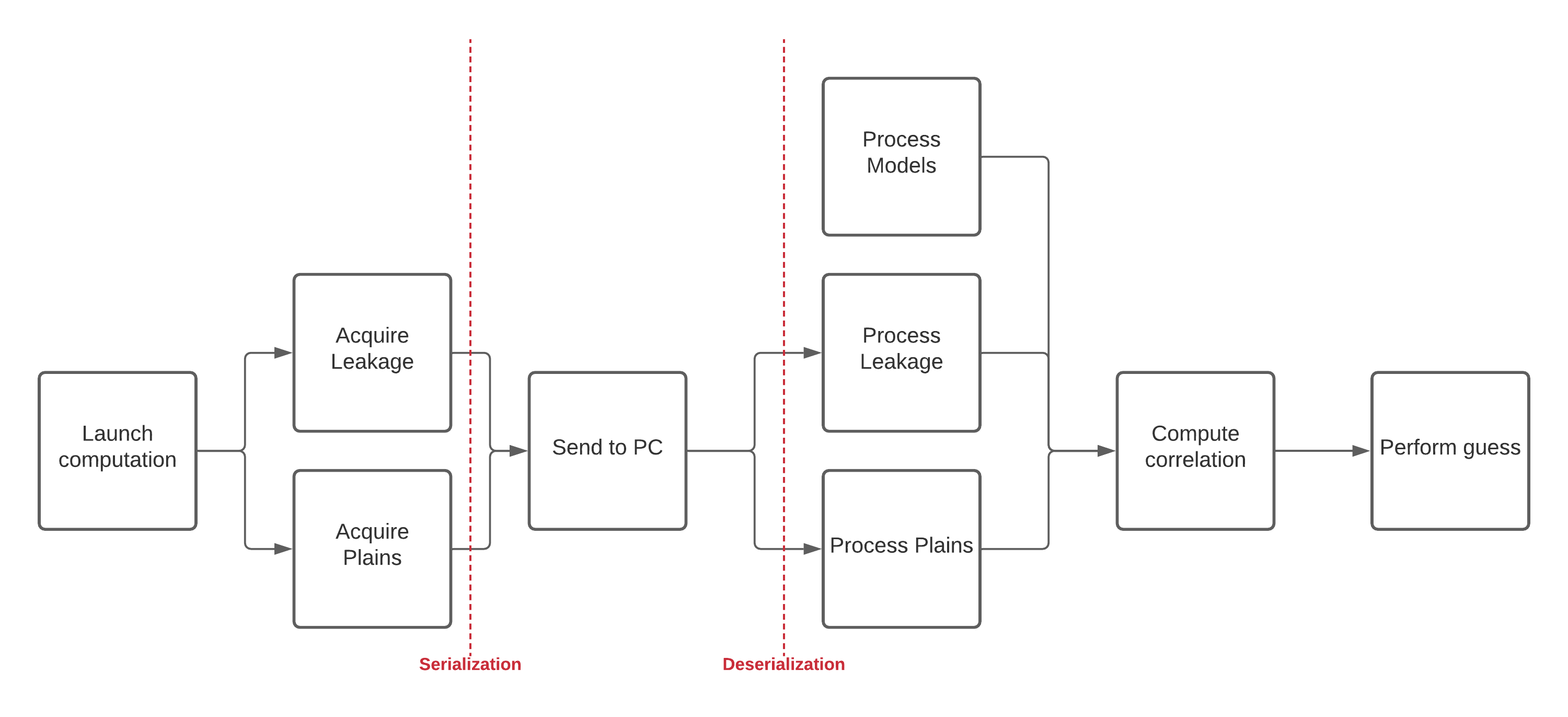 The acquisition controller is shared so the leakage is captured synchronously with the crypto-algorithm run. This allows to have consistent data among the iterations.
