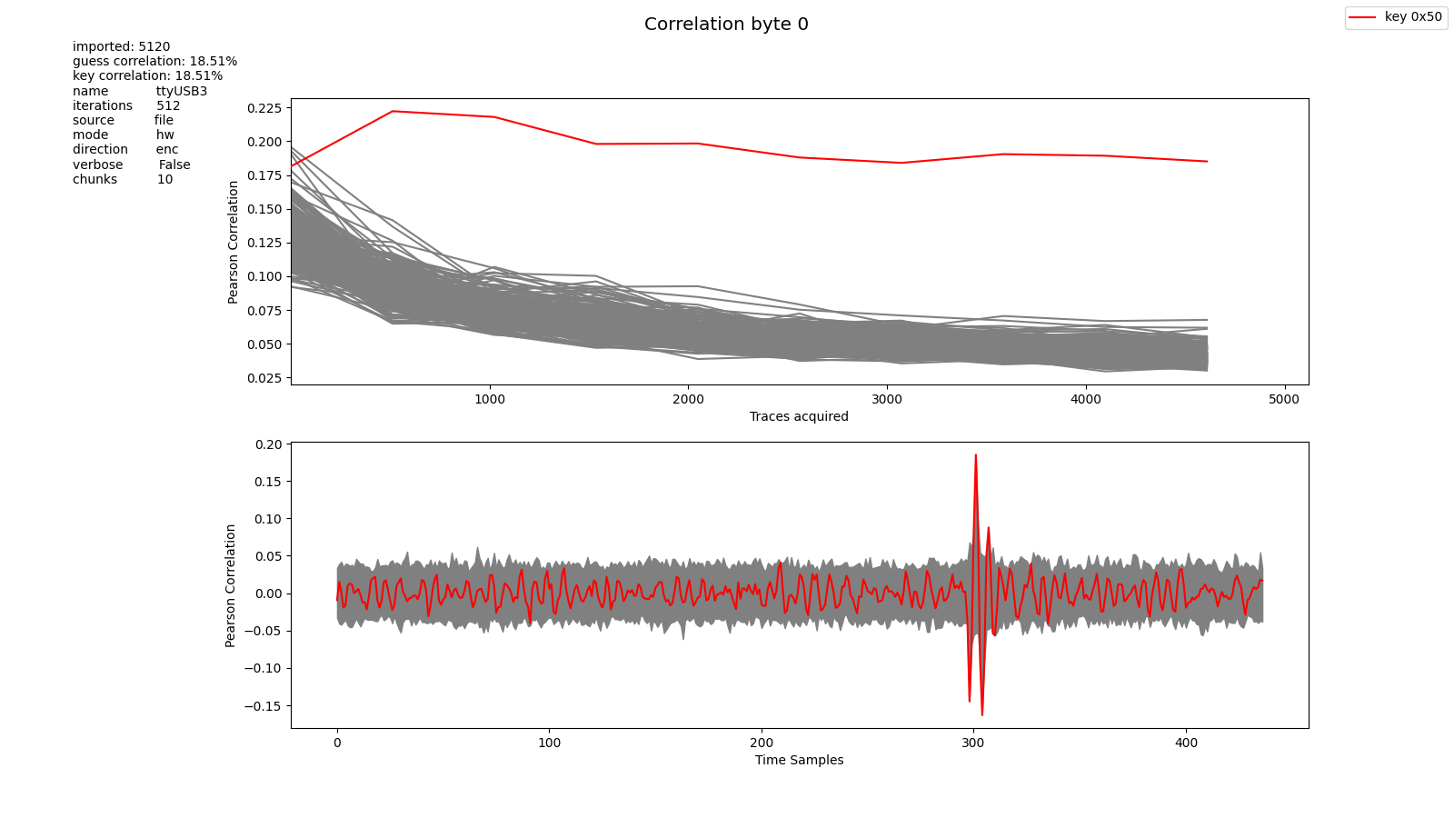 We consider that the correlation coefficient indicates how good our key hypothesis was. More precisely, we state that if the best absolute value of the coefficient is \(N\) times greater than the second best absolute correlation, the key has been guessed, \(N\) being arbitrary. Otherwise, we acquire more power leakage data in order to obtain a better correlation.